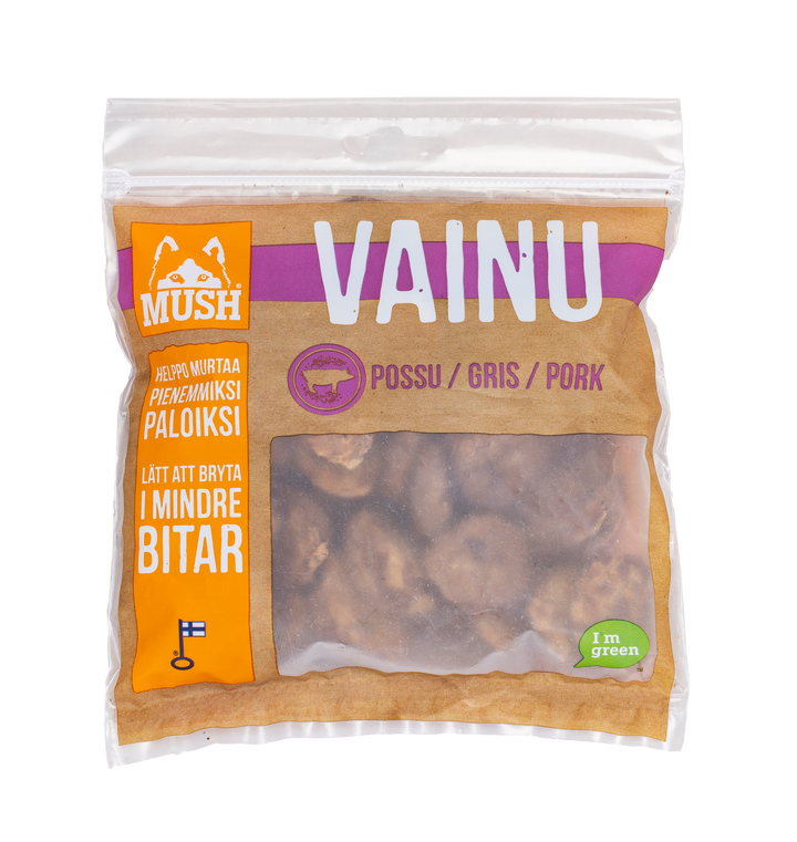 MUSH VAINU® Pork Snacks er kompakte, energirige godbidder formet i små bidder, der nemt kan brækkes i endnu mindre stykker – ideelle som belønninger eller en velsmagende snack til både hunde og katte.